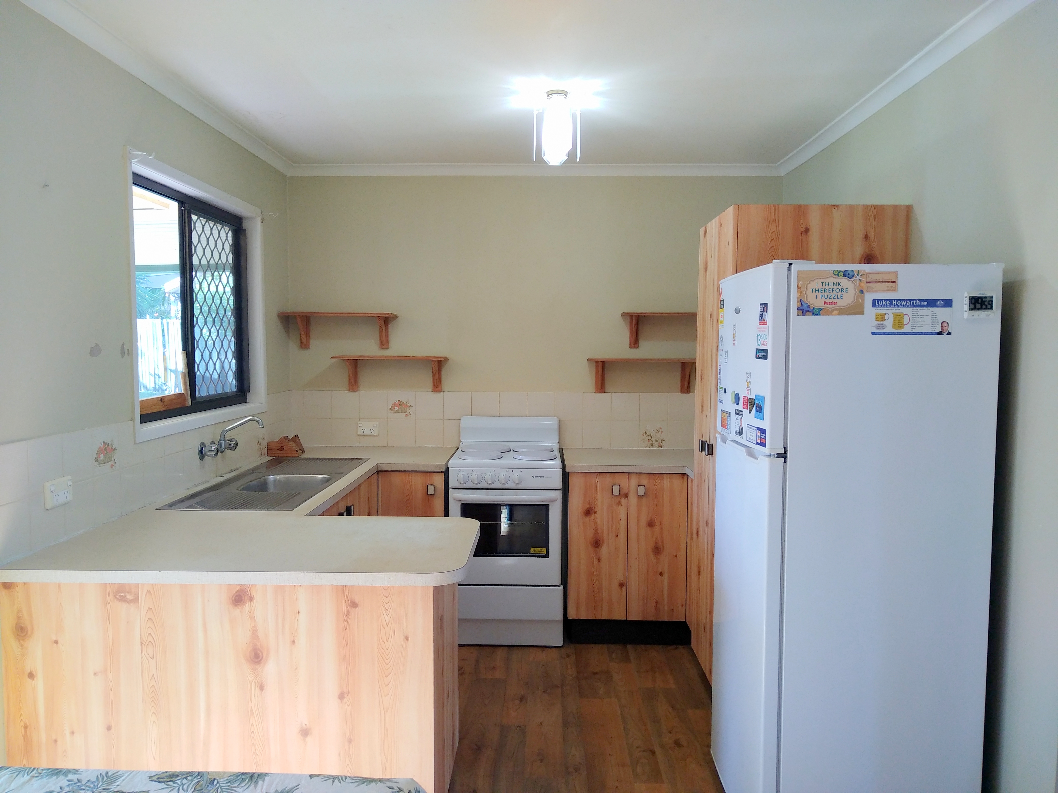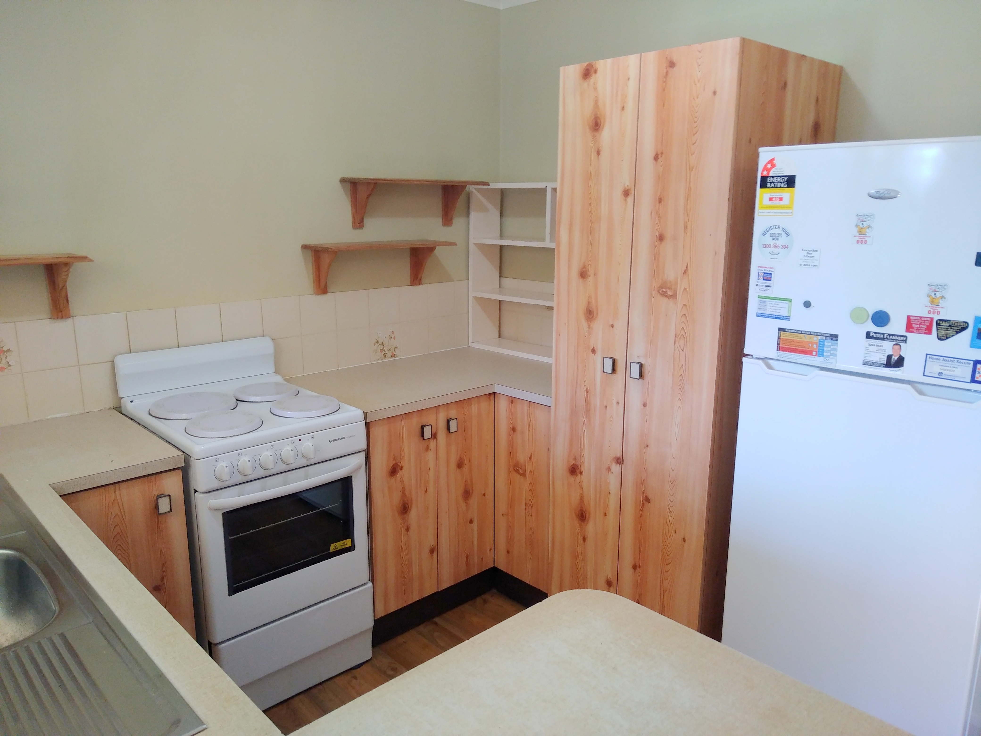 • Kitchen has upright electric stove and refridgerator that will stay