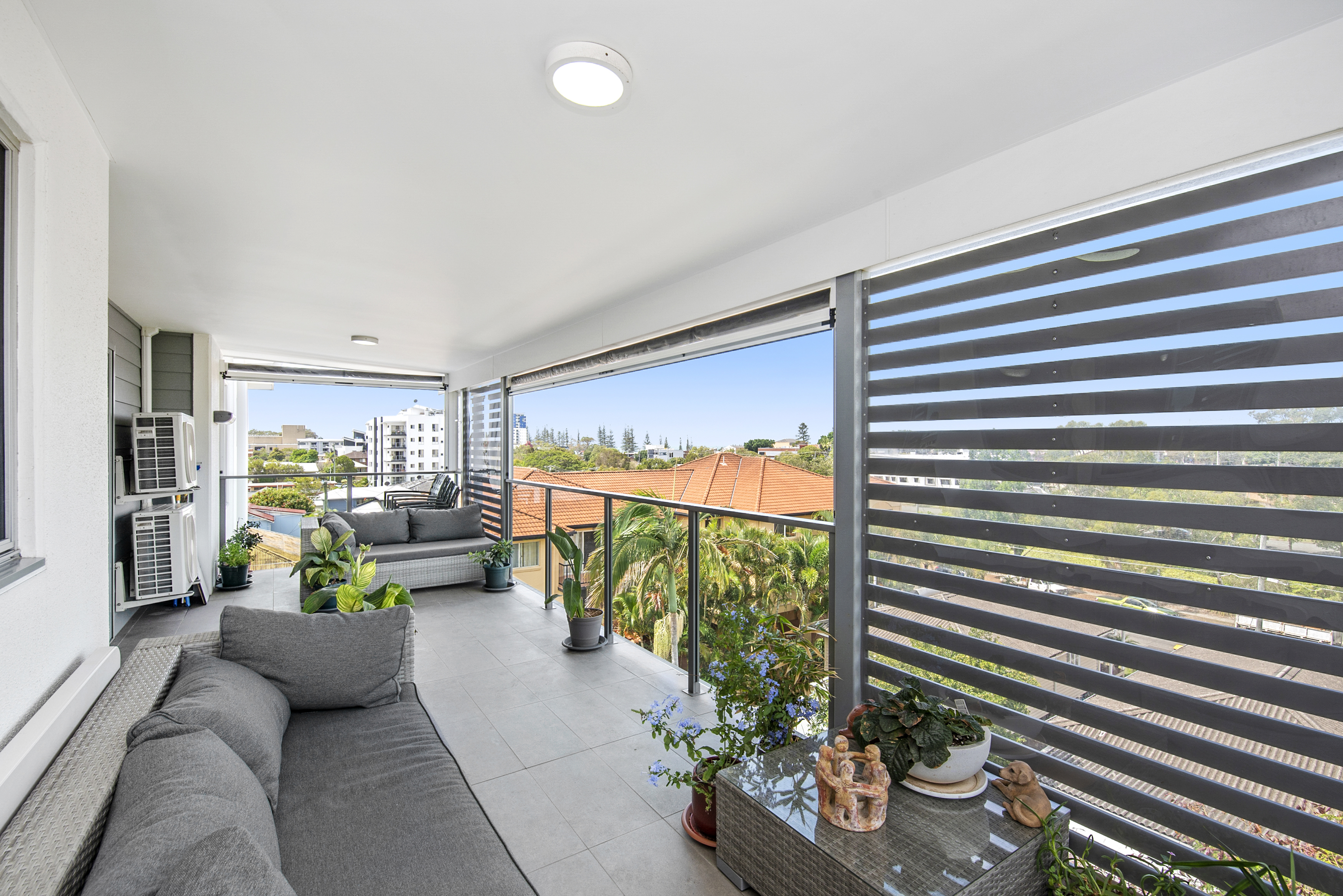 * Large tiled balcony with pull down blinds for the weather and some water views