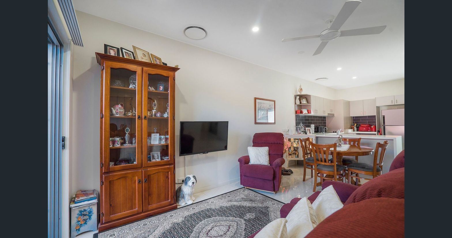 *   Lounge with glass sliders to est facing balcony, overhead fan