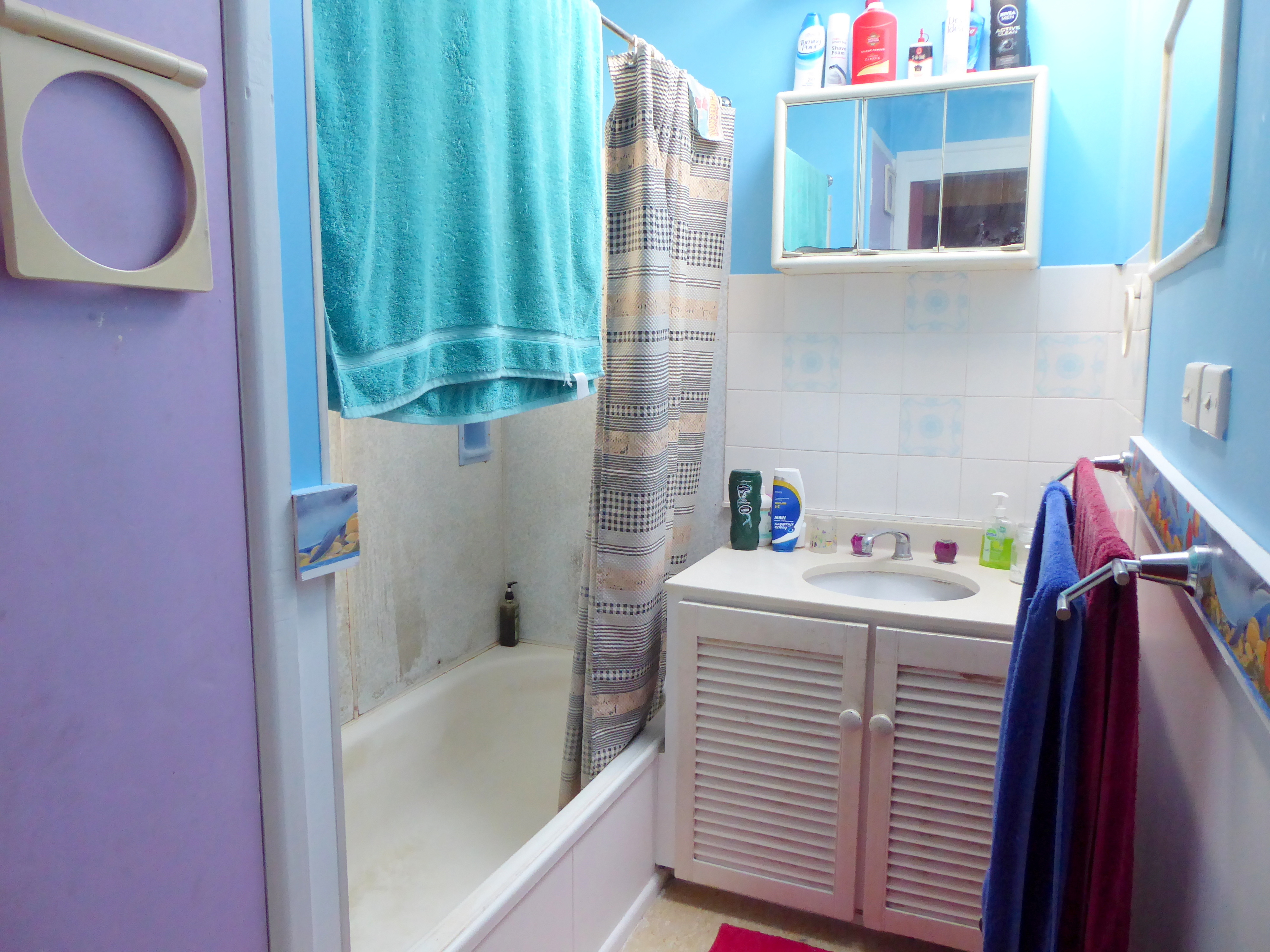 • Bathroom with shower in bath and vanity
