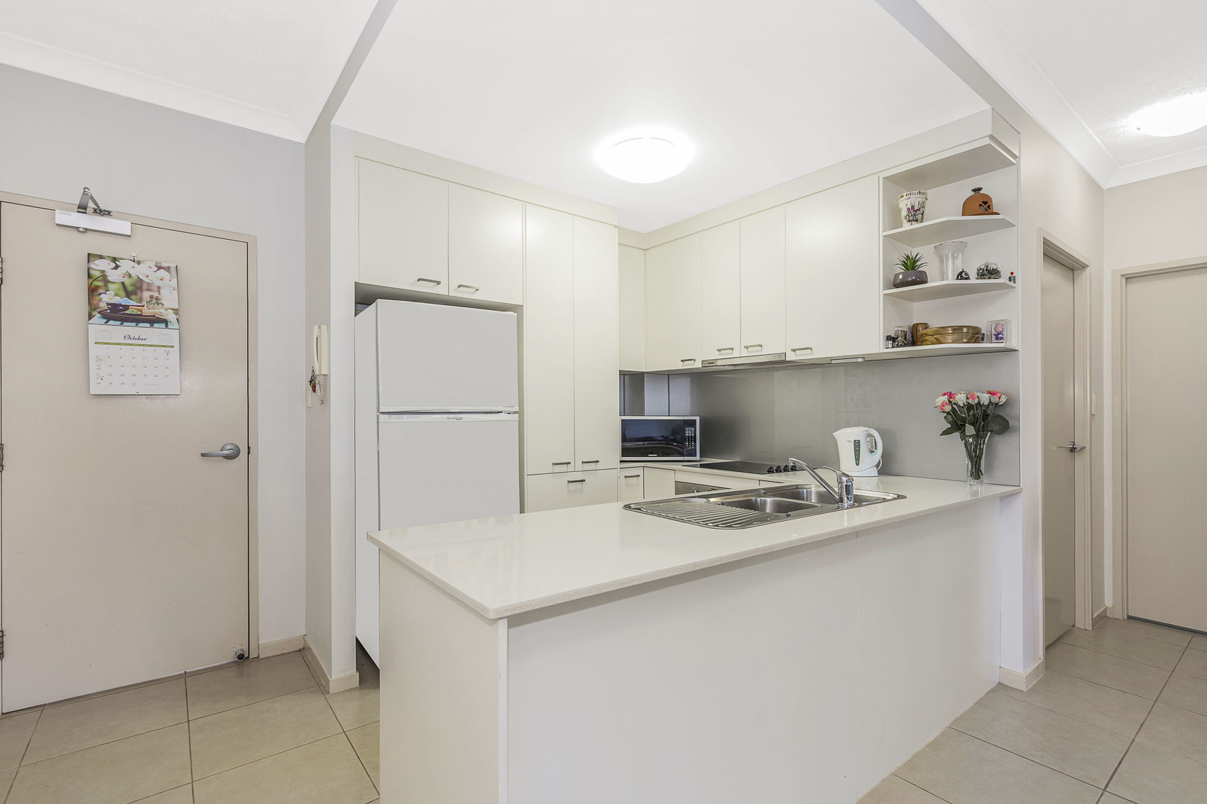 Also featuring in unit 4/14 Yacht Street Clontarf is a modern kitchen with stone benchtops and stainless steel appliances.