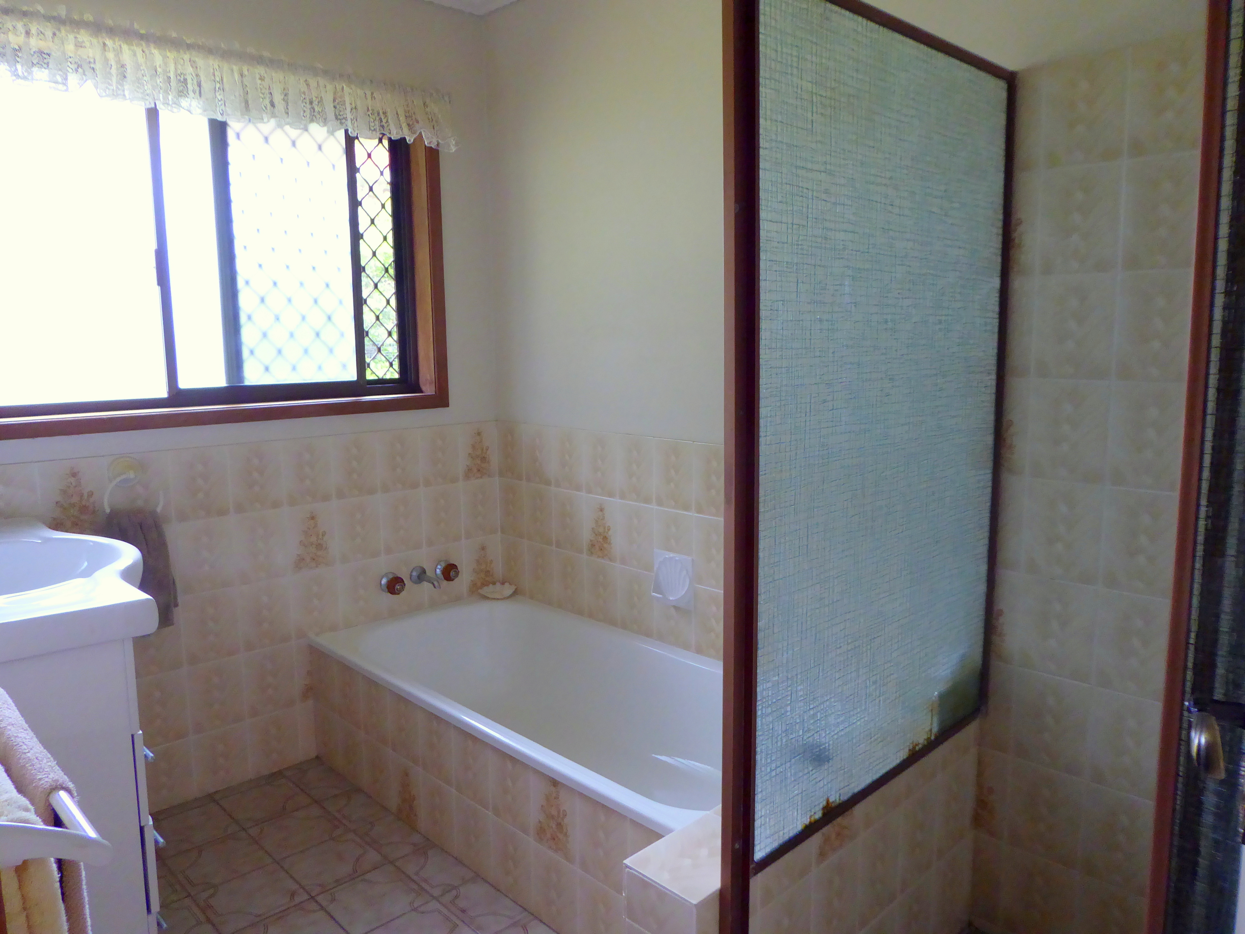 • Immaculate bathroom with bathtub, shower and vanity basin with storage. The toilet is separate