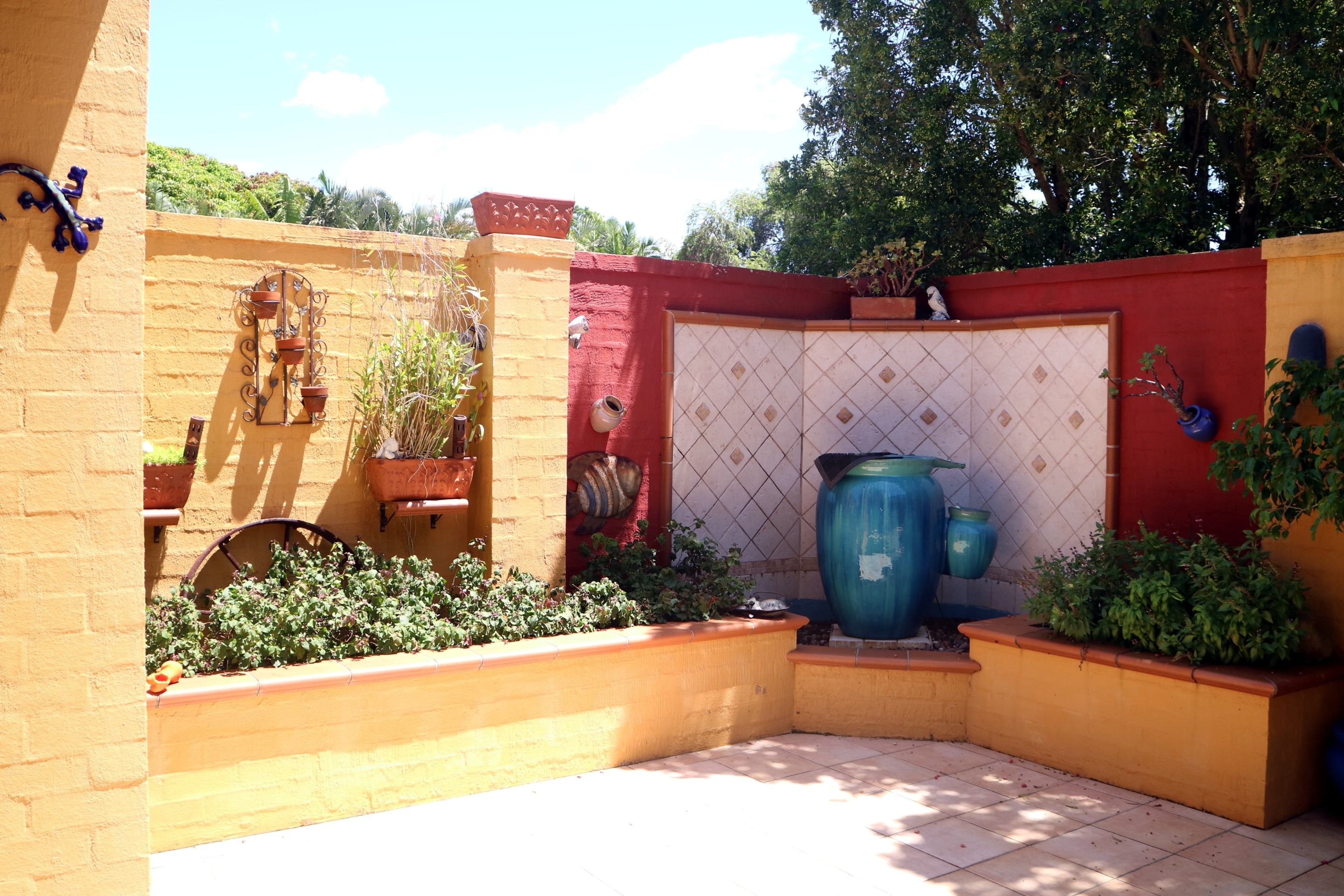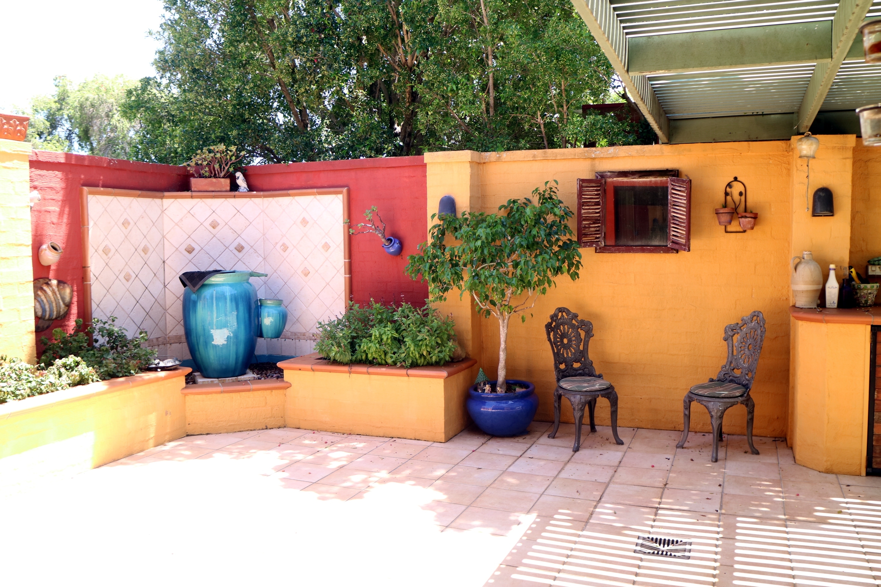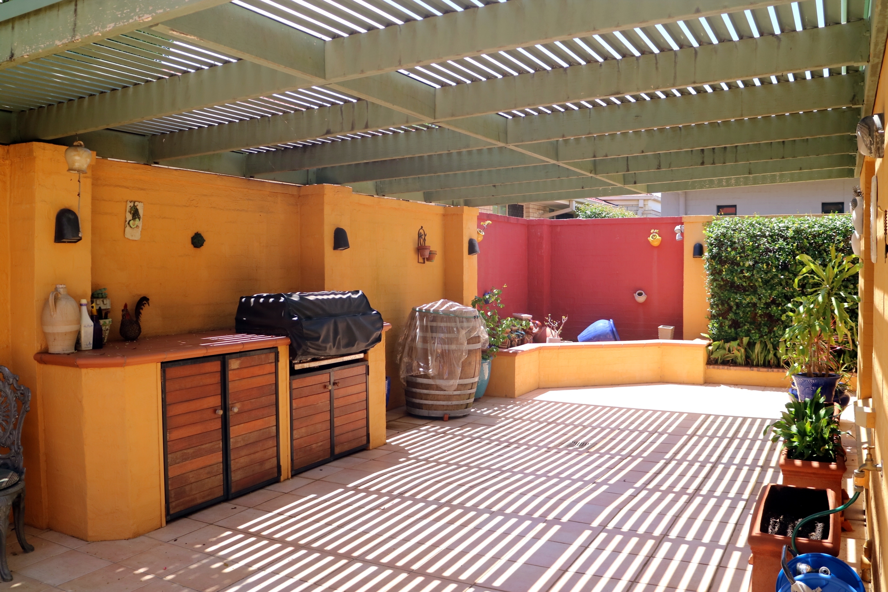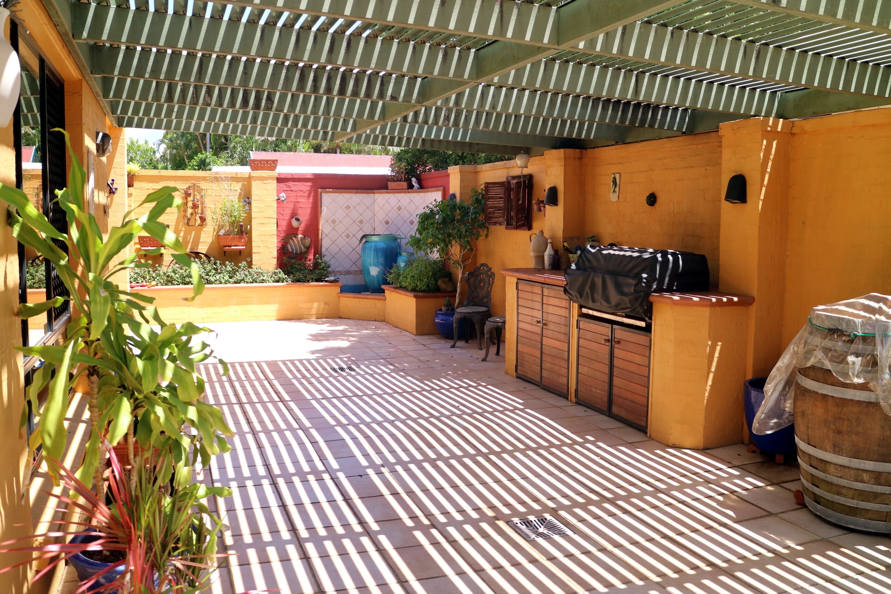 The outside entertaining area is Spanish and fun,  lots of lovely bit and pieces setting this home apart from the usual. A great place to entertain family and friends with a full length featured area.  Built in BBQ and a colourful art will have your guests talking.