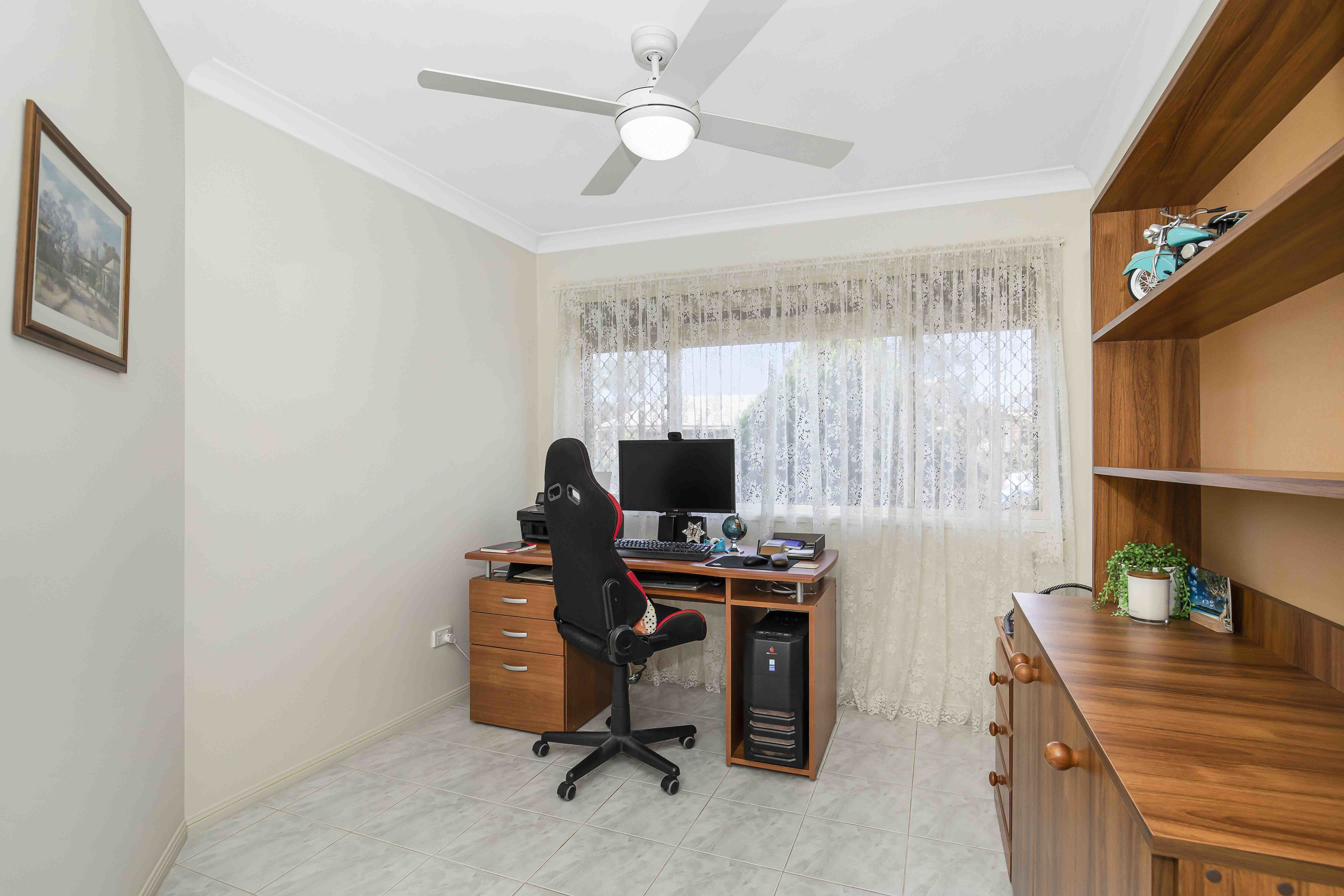 * Tiled office with ceiling fan and plenty of room for office equipment