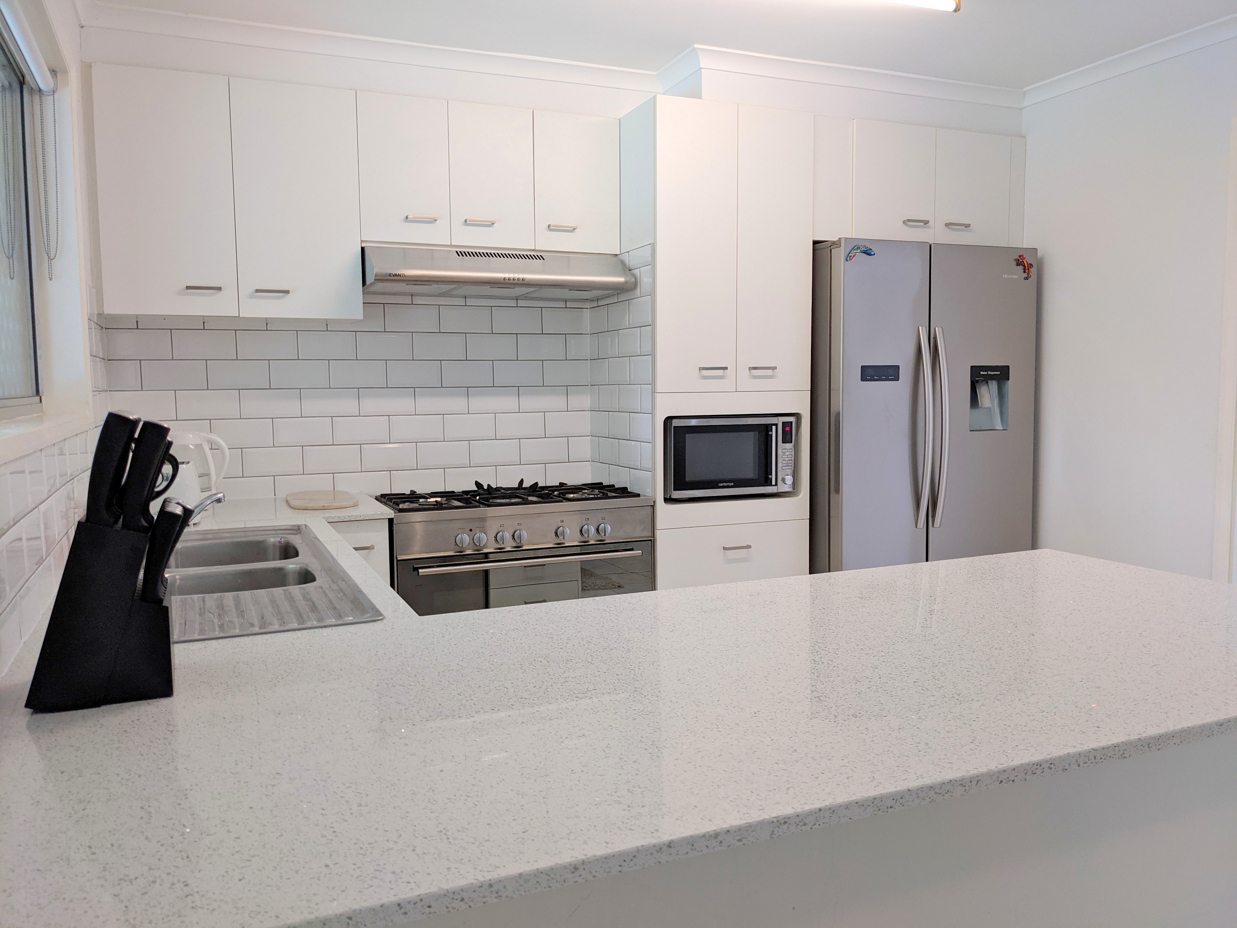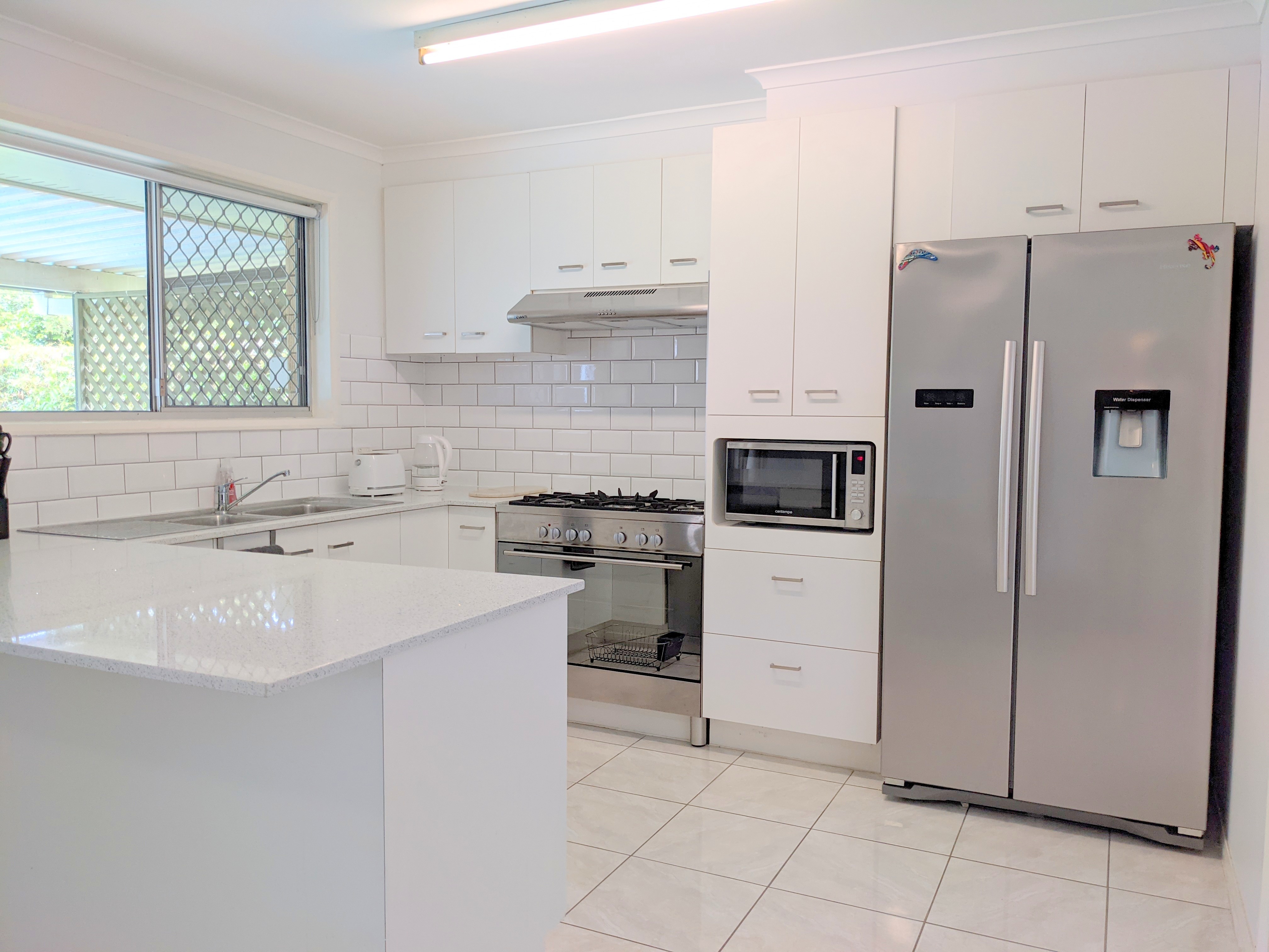 • Kitchen has brand new stone quartz benchtops, gas cooktop and electric oven, rangehood, double door fridge space and ceiling fan