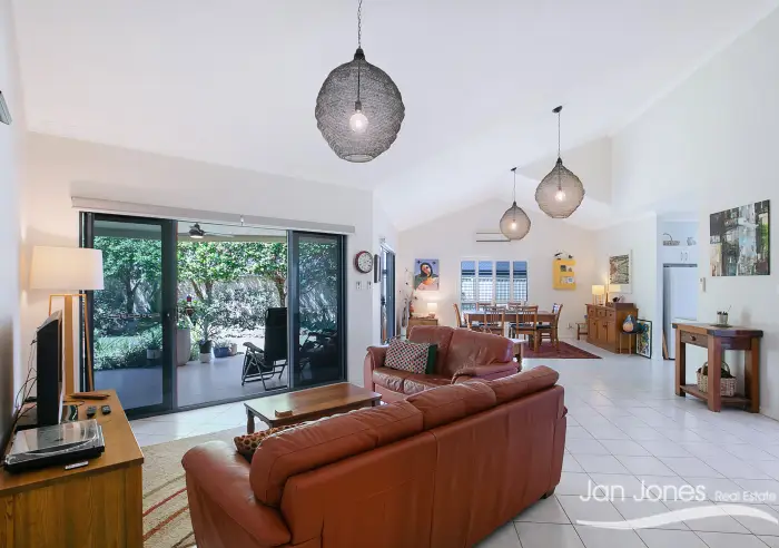 • Open plan family, dining and kitchen. This space is air conditioned, has electric blinds on two sets of sliding doors which flow beautifully to the North facing covered entertainment area and garden beyond