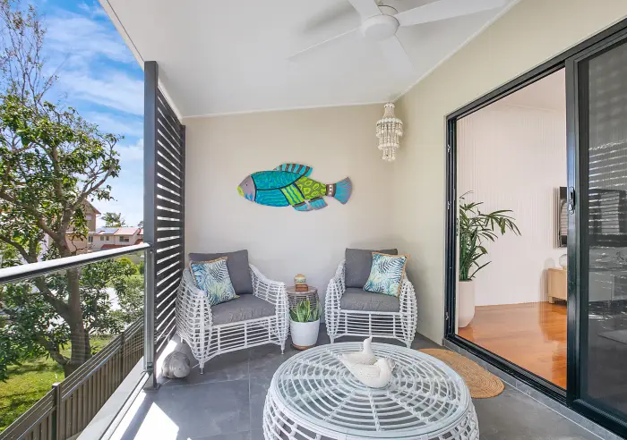 Step outside onto the covered balcony, where you’re greeted by a lush canopy of green foliage. It’s a peaceful, leafy backdrop that ensures total privacy, making it the perfect nook for evening wine or a quiet book.