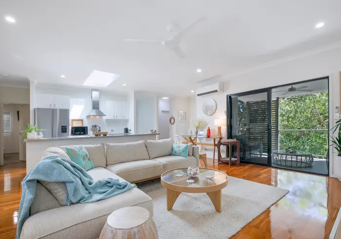 As you ascend to the upper level, the warmth of rich timber floorboards guides you through an expansive open-plan living and dining sanctuary. Bathed in natural light and kept perfectly cool with air conditioning, this space flows seamlessly into a sleek galley-style kitchen. With an oversized breakfast bar and abundant workspace, it’s the ideal spot for morning coffee or hosting friends while you whip up a gourmet meal.