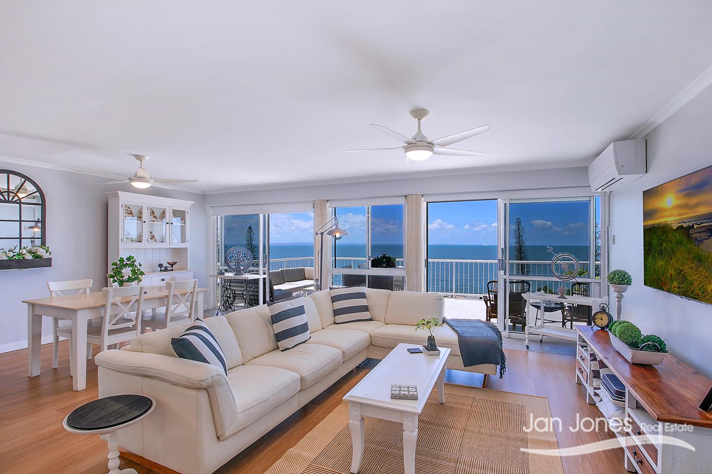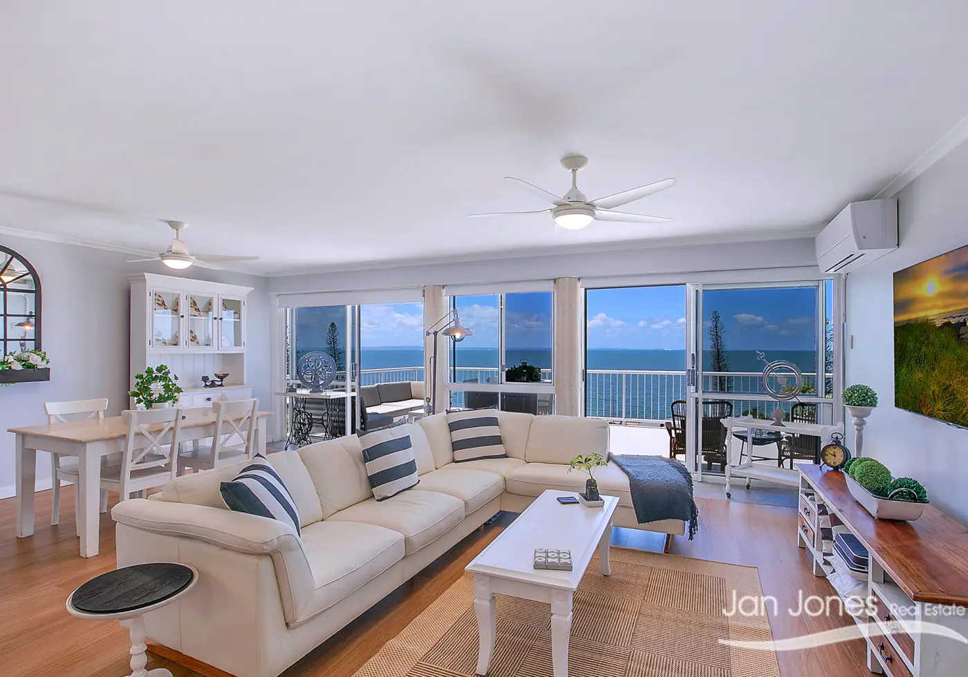Generous outdoor balcony with stunning water views across Margate Beach to Moreton Island that has an automatic awning for those hot summer days